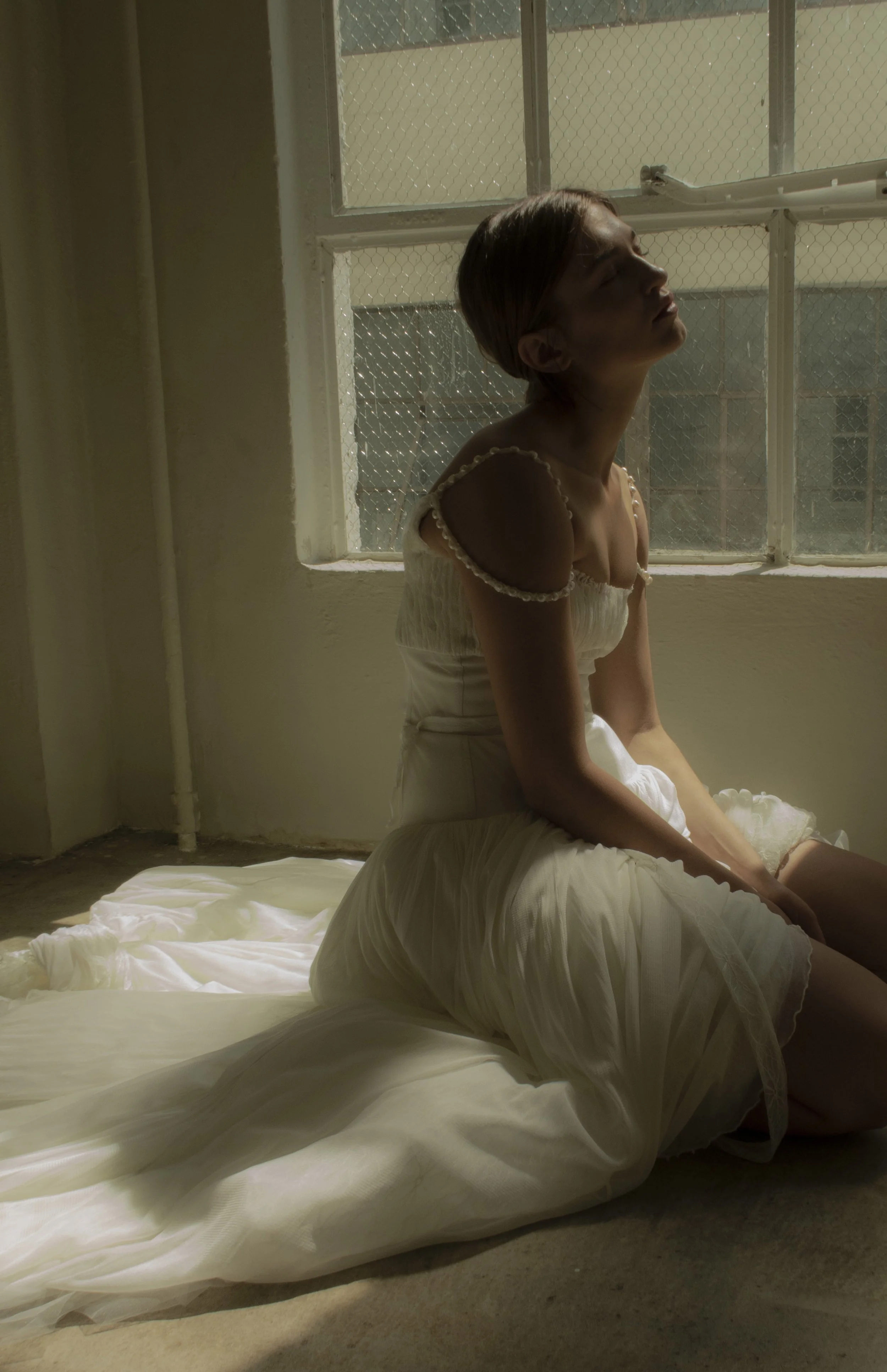 Pin-tucked lace empire gown with drop waist. The Elizabeth features broomstick pleated silk tulle and lace with fresh water pearls straps. The Elizabeth pairs beautifully with our lace pin-tucked gloves.